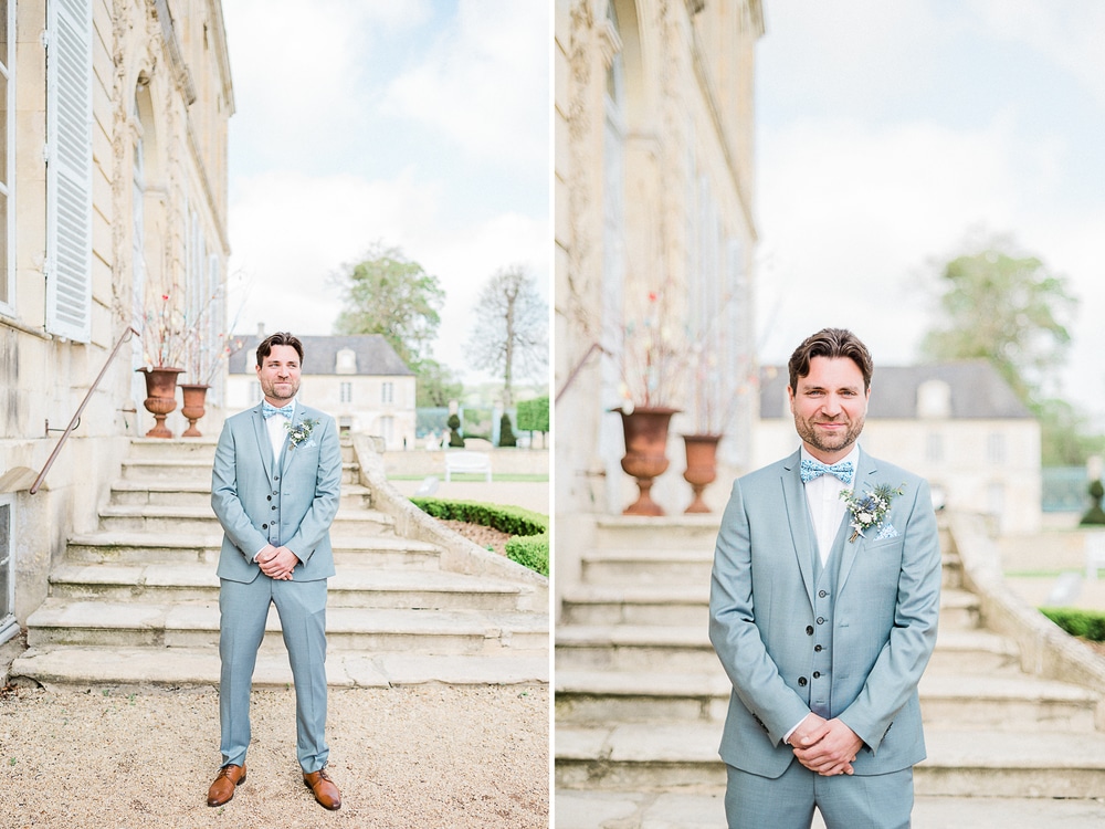 Voici un moment particulièrement émouvant pour la photographe de mariage : les préparatifs de Laurine et Alexandre avant leur grande rencontre sur les marches du Château de Canon et la découverte de la robe de mariée de Laurine. Les témoins ont ainsi assisté la mariée au moment de revêtir sa robe de mariée, pendant que ceux du marié prenaient leur temps pour lui attacher son nœud papillon et boutonner son gilet bleu.